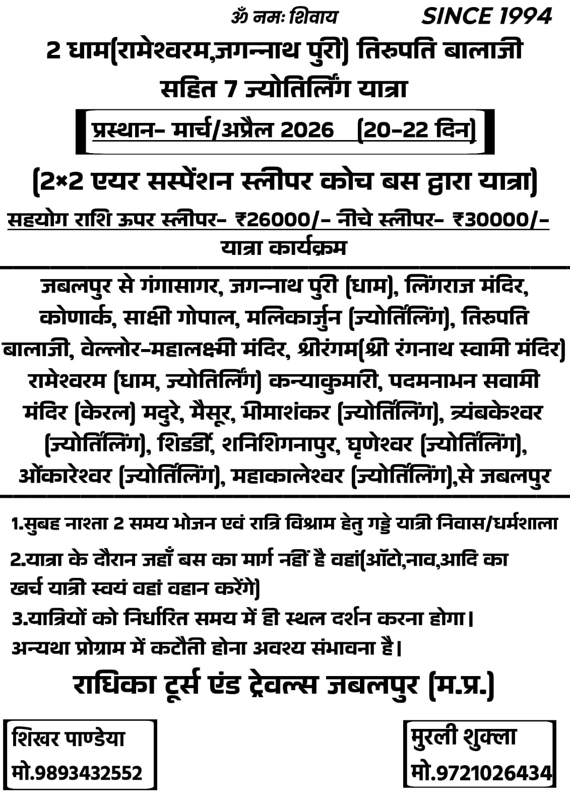 catg_post Rameshwaram, Jagannath Puri, Tirupati Balaji and 7 Jyotirling Yatra triwebsol@gmail.com Feb 24, 2026 0 March April 2026 Read More